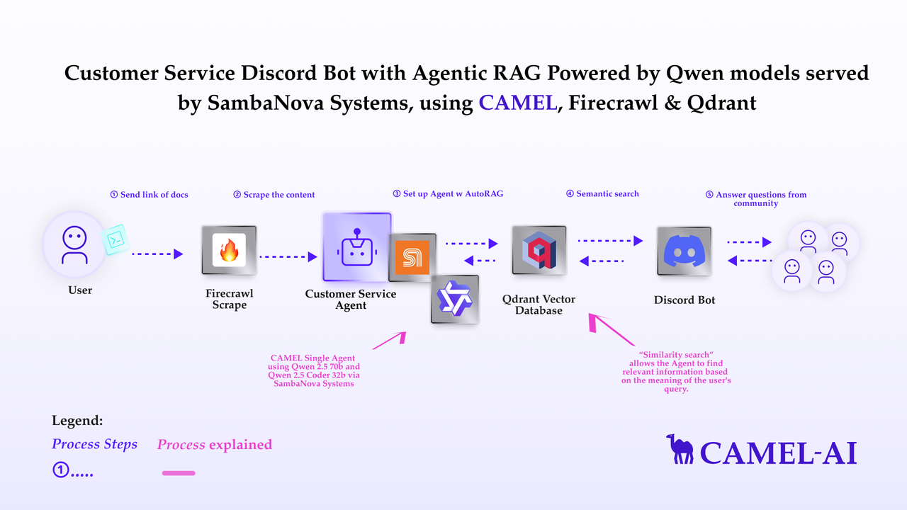 You can explore an example notebook that demonstrates how to build a Customer Service Discord Bot using Camel-AI, Qwen models served by SambaCloud, Firecrawl, and Qdrant: This hands-on guide is a great way to get started with Camel-AI’s capabilities.