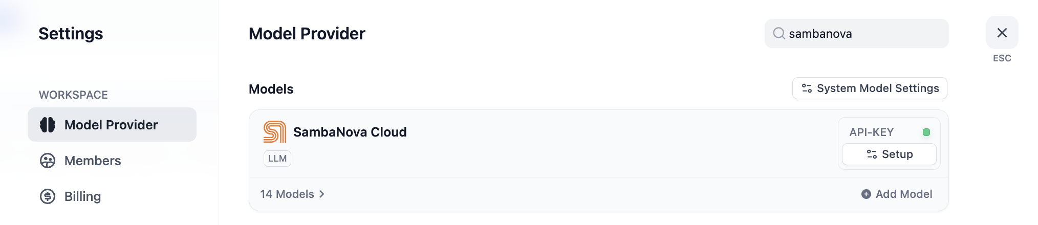 Go to Settings (or Dify Marketplace), select “SambaCloud” from the list of Model Providers, enter your SambaNova API key, and choose your preferred model.